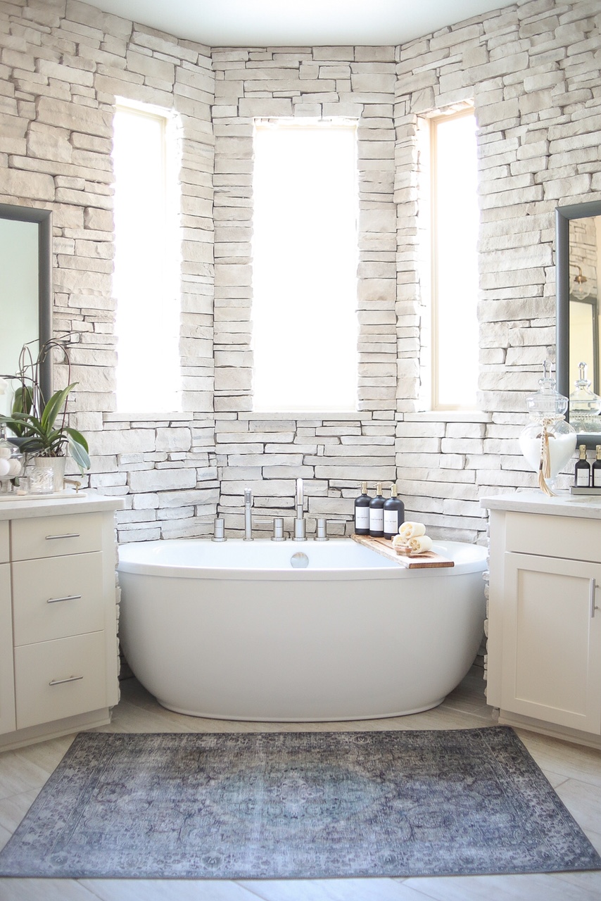 A: "I chose Nob Hill Thin Brick with White Aspen mortar because I love the way it blends seamlessly with a mix of metals, woods, and cabinet finishes. It was the perfect compliment. I also chose to do a “messy mortar” style to give it an old feel. Outlets and switches were moved underneath the cabinetry for an authentic and uninterrupted result."