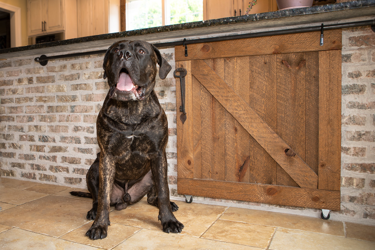 A: "My least favorite part of the process was painting the all the cabinets. There were a lot. A good playlist helped me get through it! My favorite part was covering up those faux doors on the peninsula with brick and then adding the mini barn door to create access to the one deep cabinet. I repurposed the original front door knocker as a the handle for the barn door cabinet."